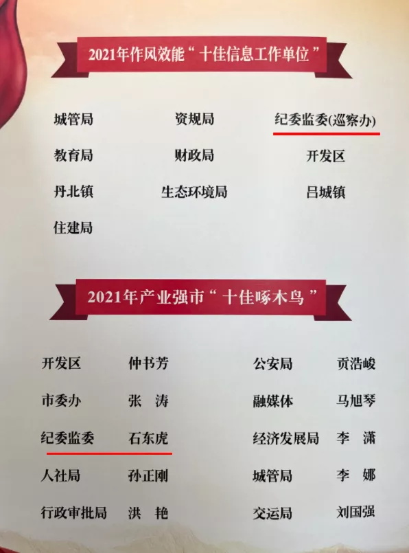 会上,市纪委监委荣获“2021年度优质效能服务单位”称号,并获得优质效能服务标兵、作风效能“十佳服务品牌”、作风效能“十佳信息工作单位”、产业强市“十佳啄木鸟”等多项荣誉,喜迎虎年“开门红”。